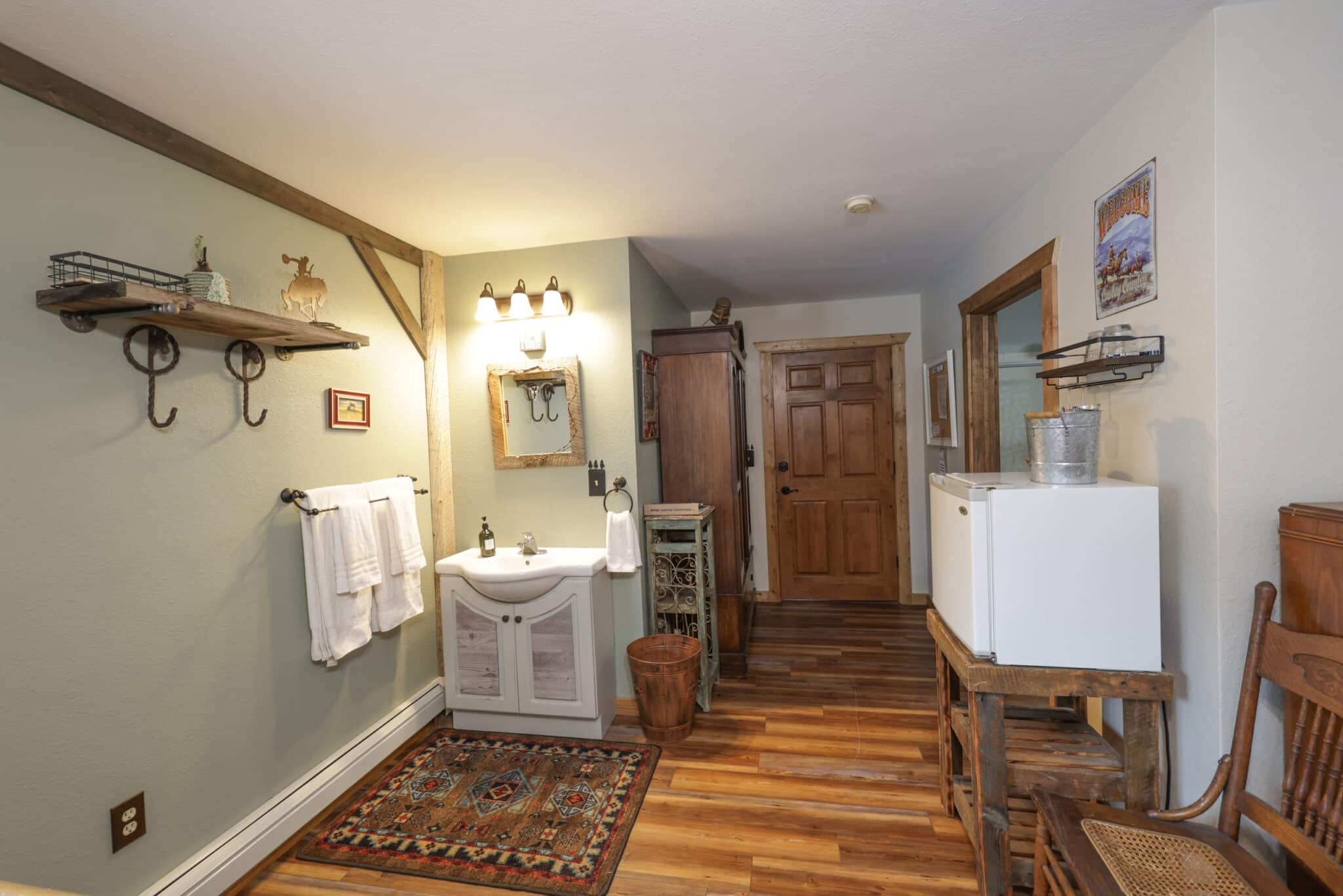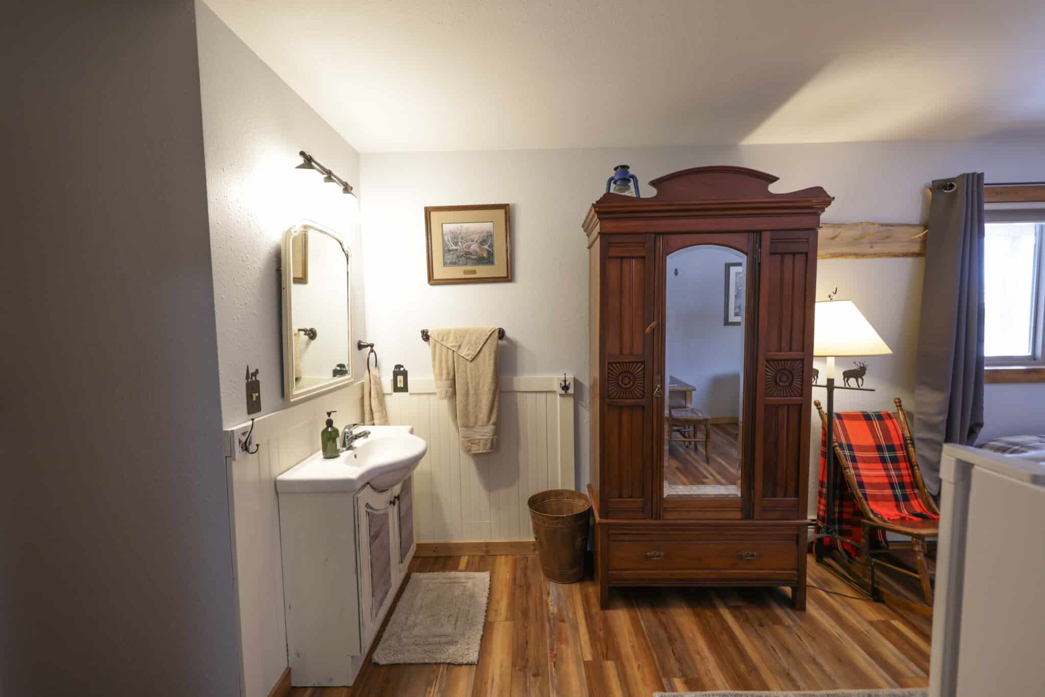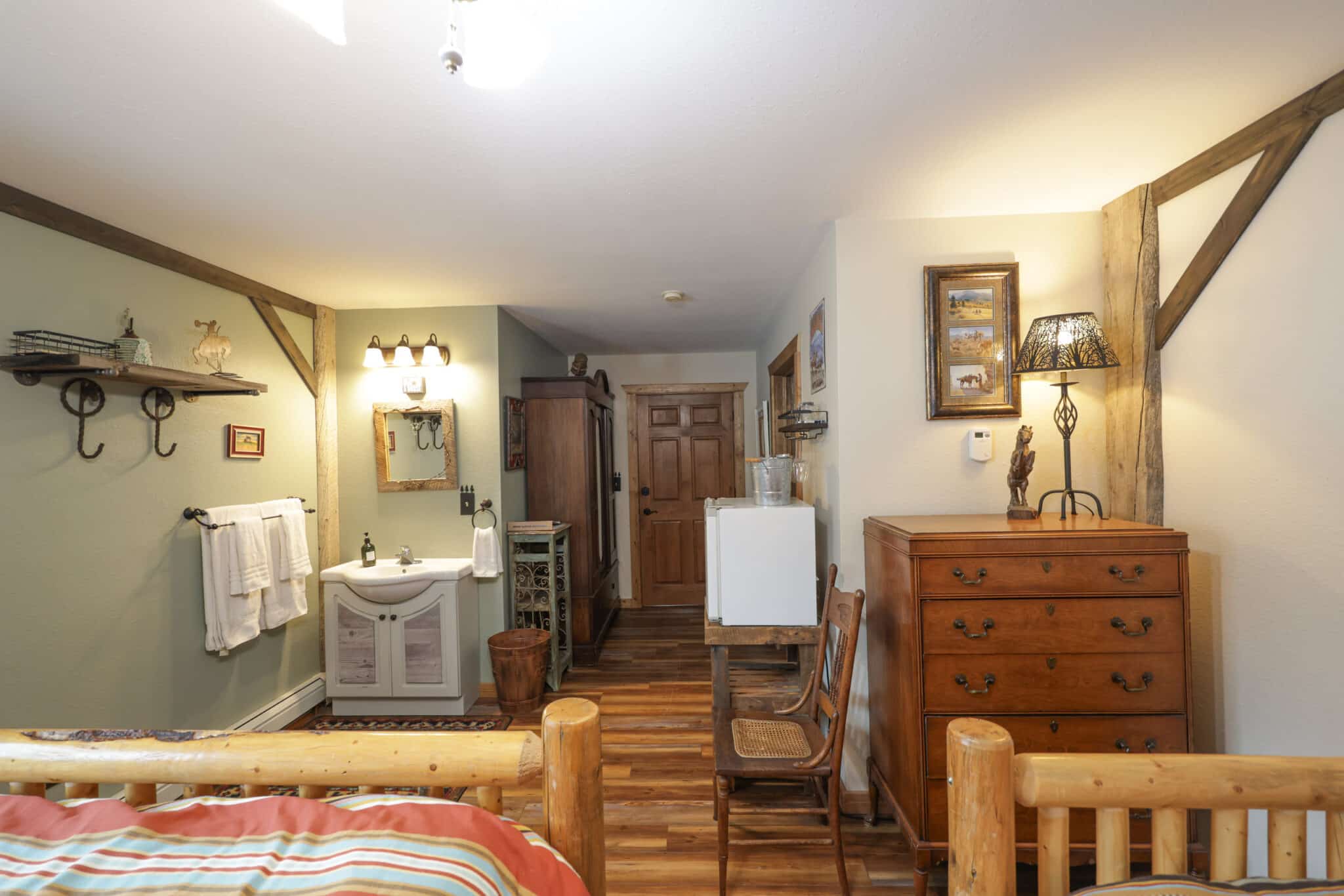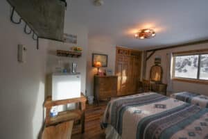 CABIN 1B: This cabin is two rooms with a full bathroom. Coffee maker and mini fridge makes this cabin a great hideaway while giving you the meals and social time in the lodge. There is a double bunk in the main room and a single bed in the second room. Cabin is a minimum of two guests. |
