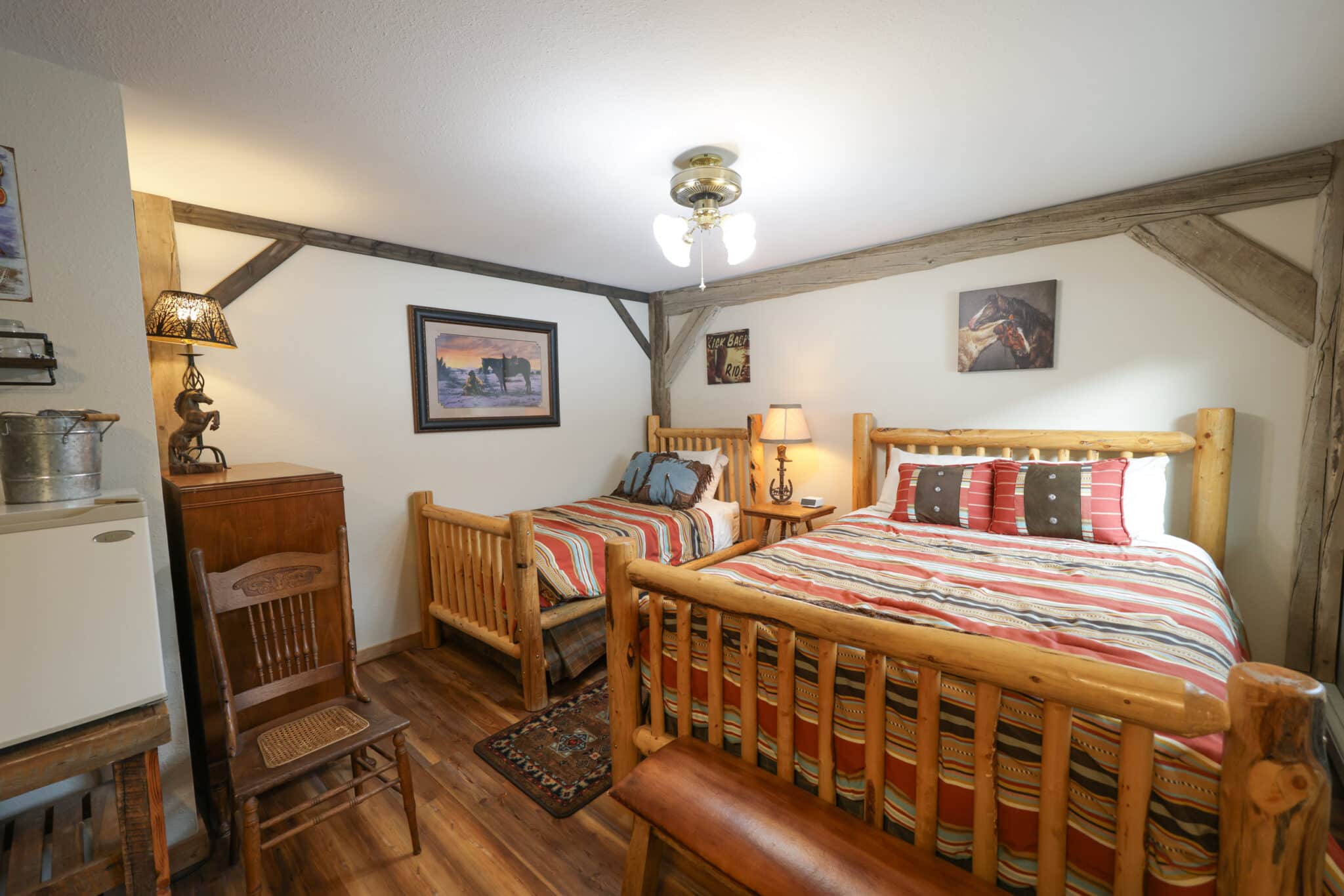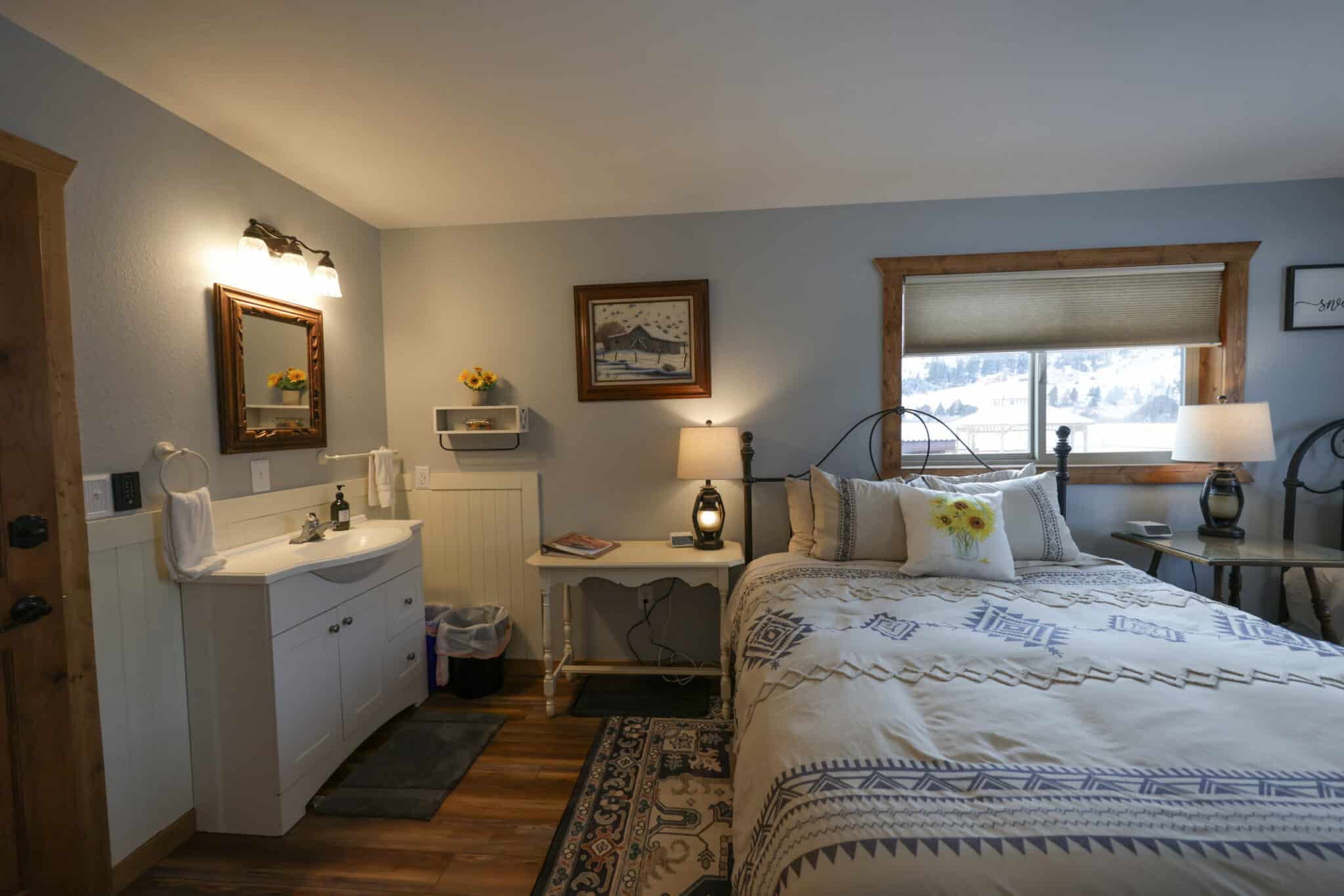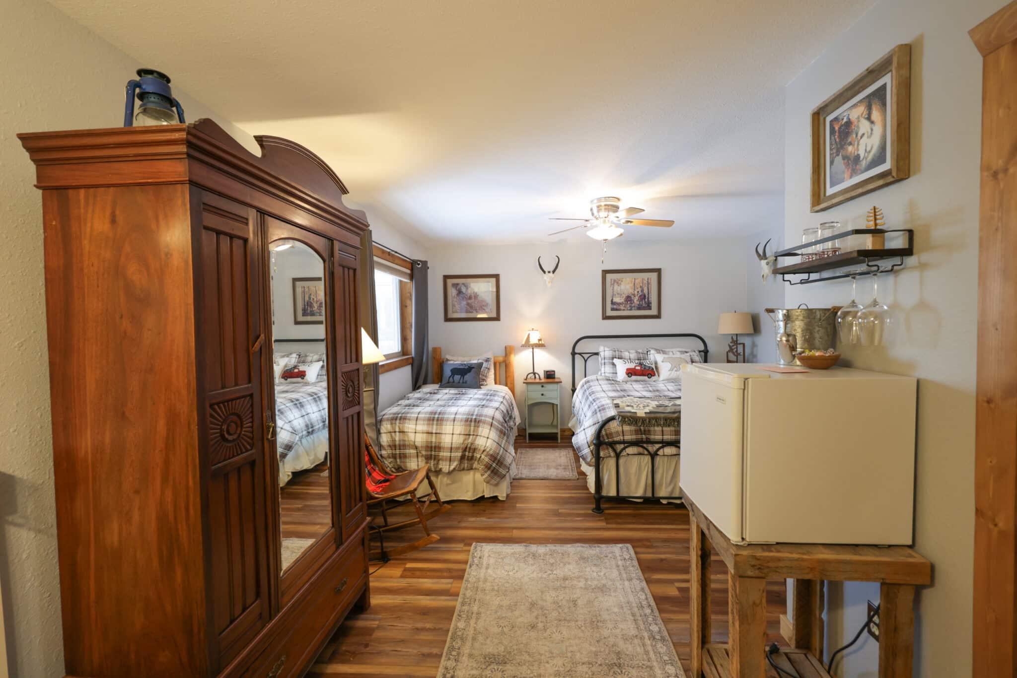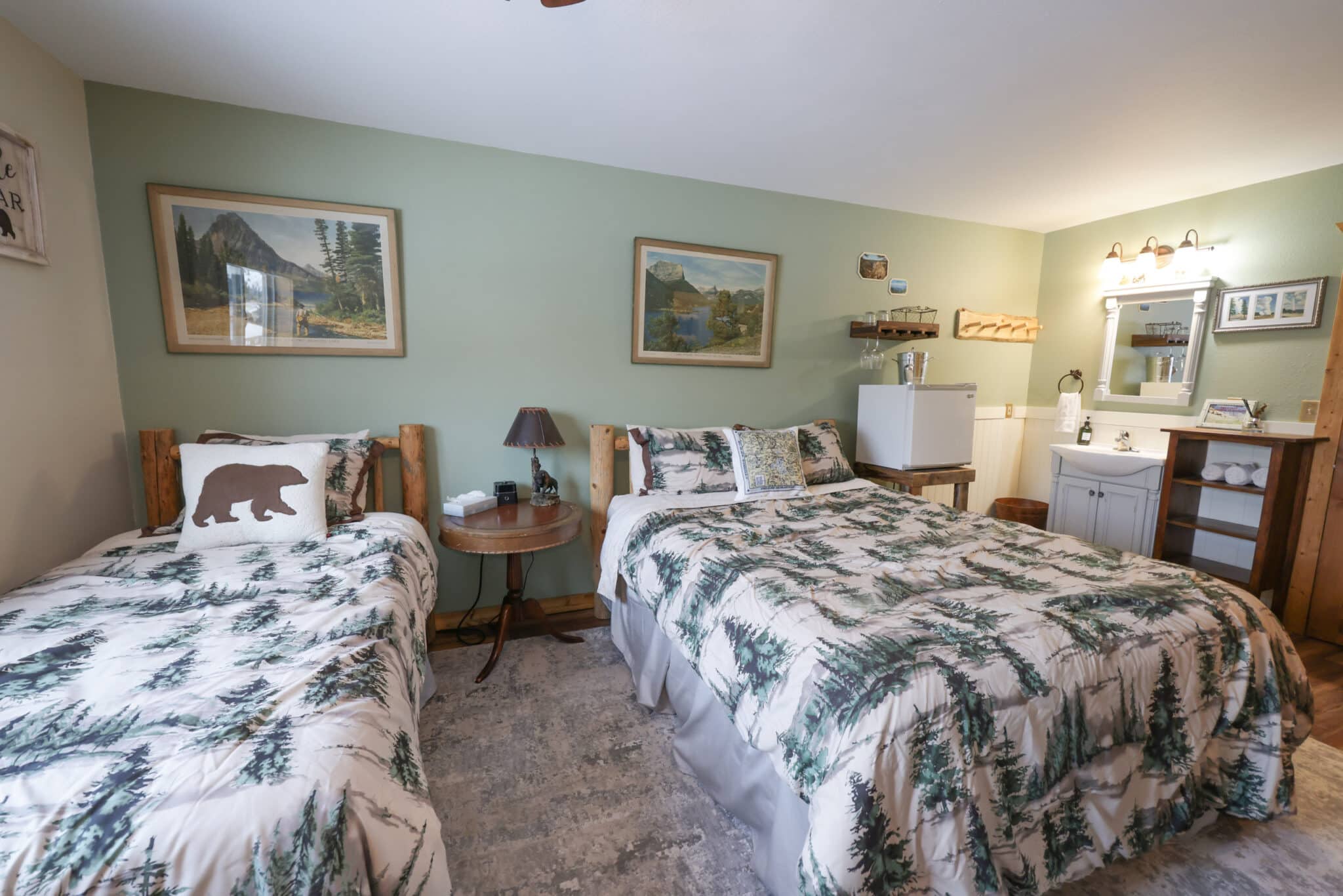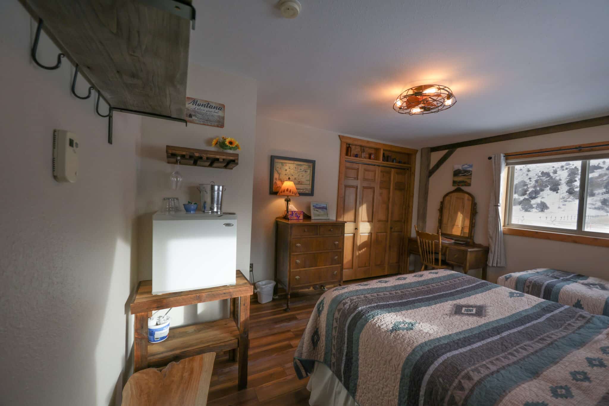 CABIN 1A: Putting your feet up in our two bedroom one bath cabin with a mini kitchen is easy to forget time as this cabin is situated so you can enjoy the beautiful Montana sunsets. Master bedroom has a queen and single bed. The second bedroom consists of a single bed and a set of bunks. Cabin is minimum of three guests.