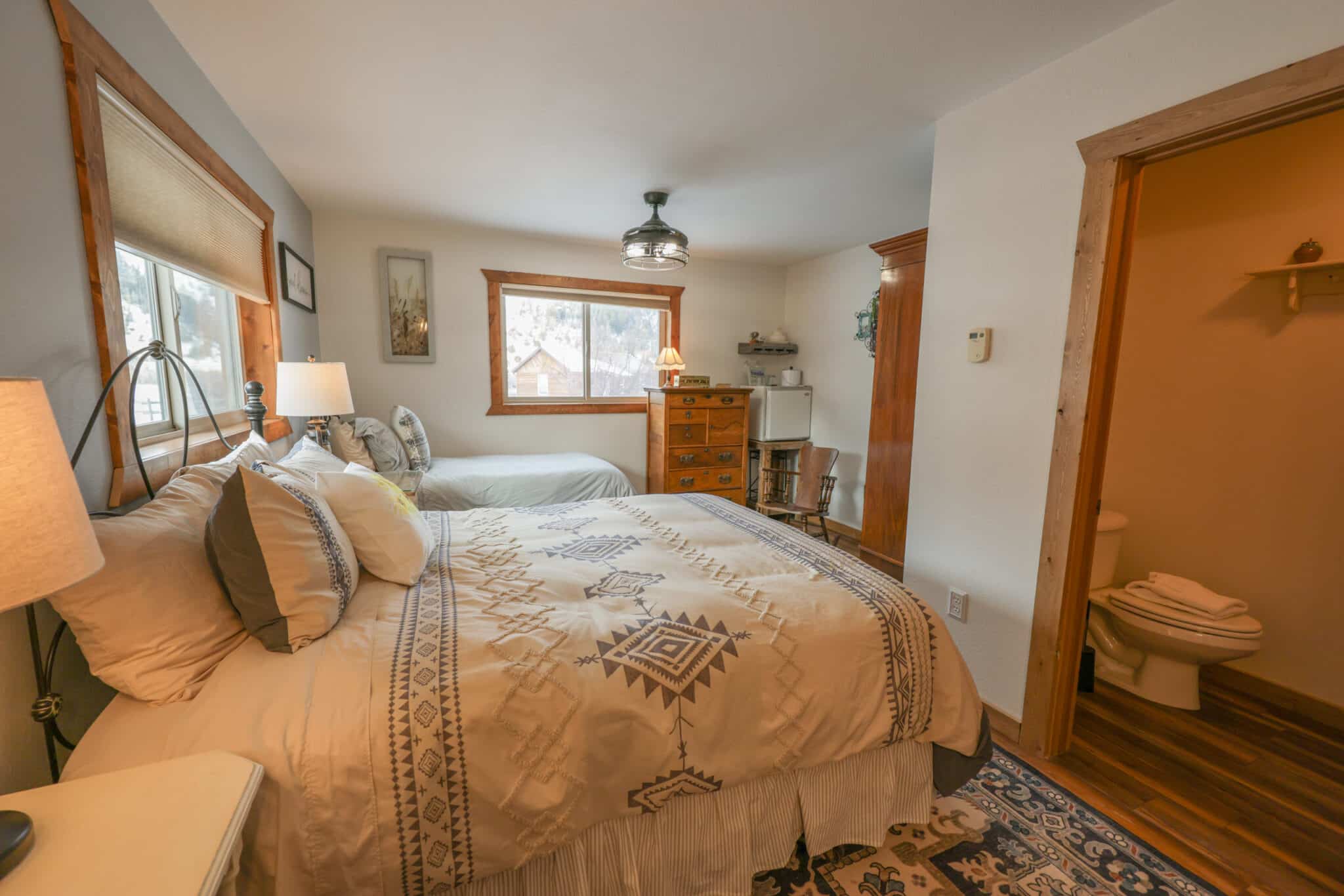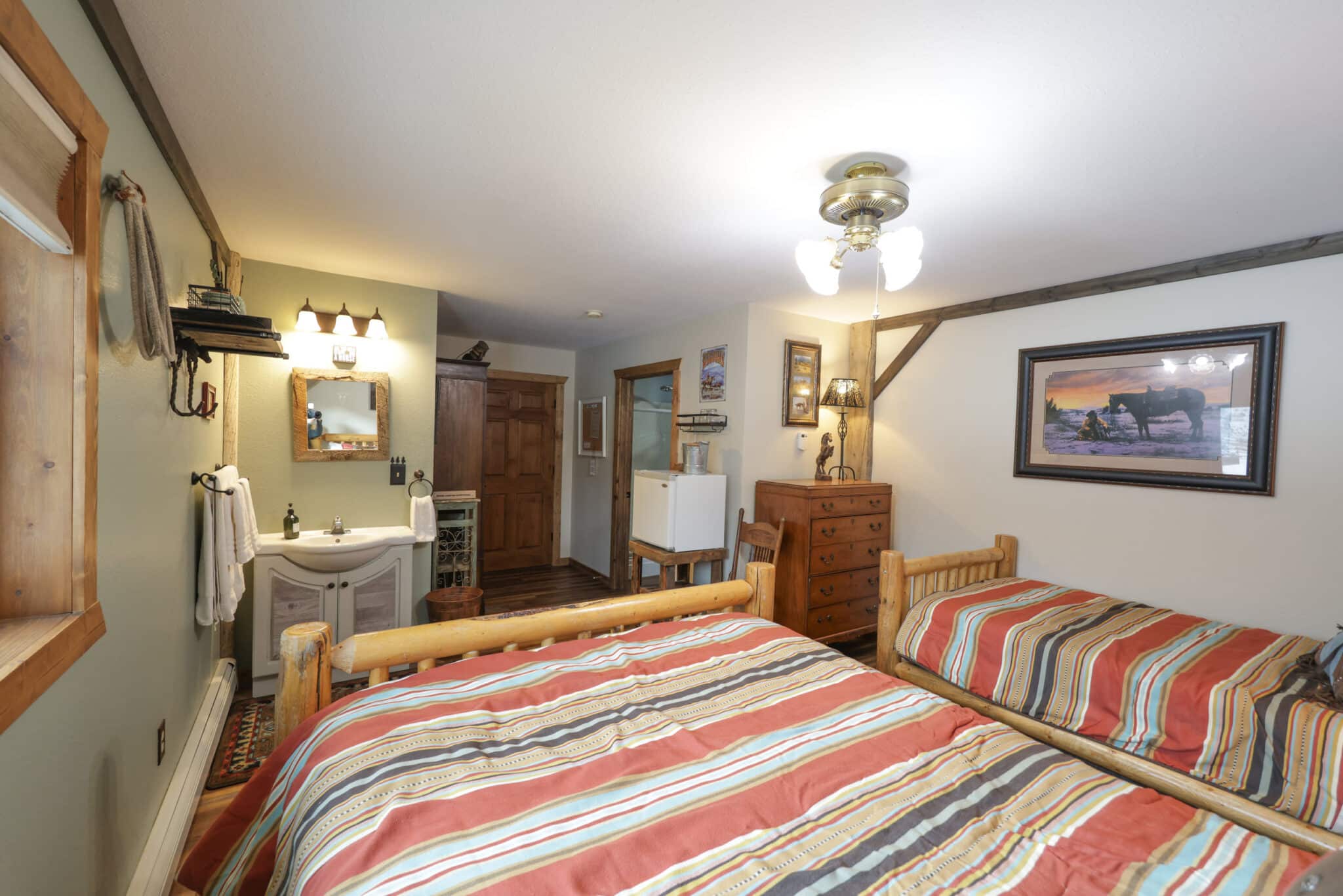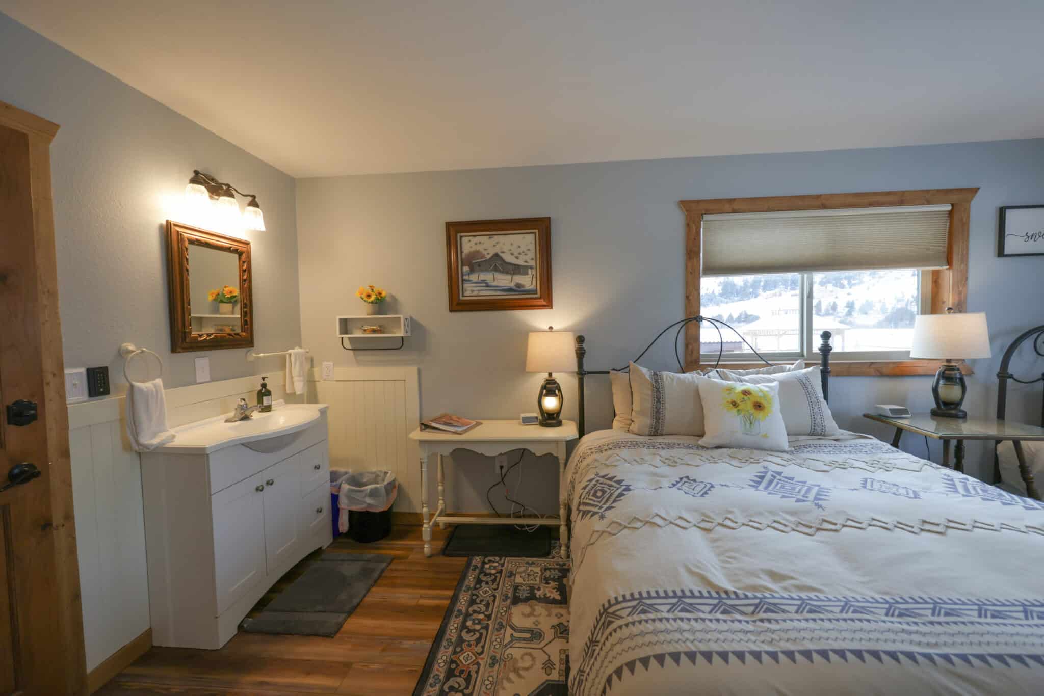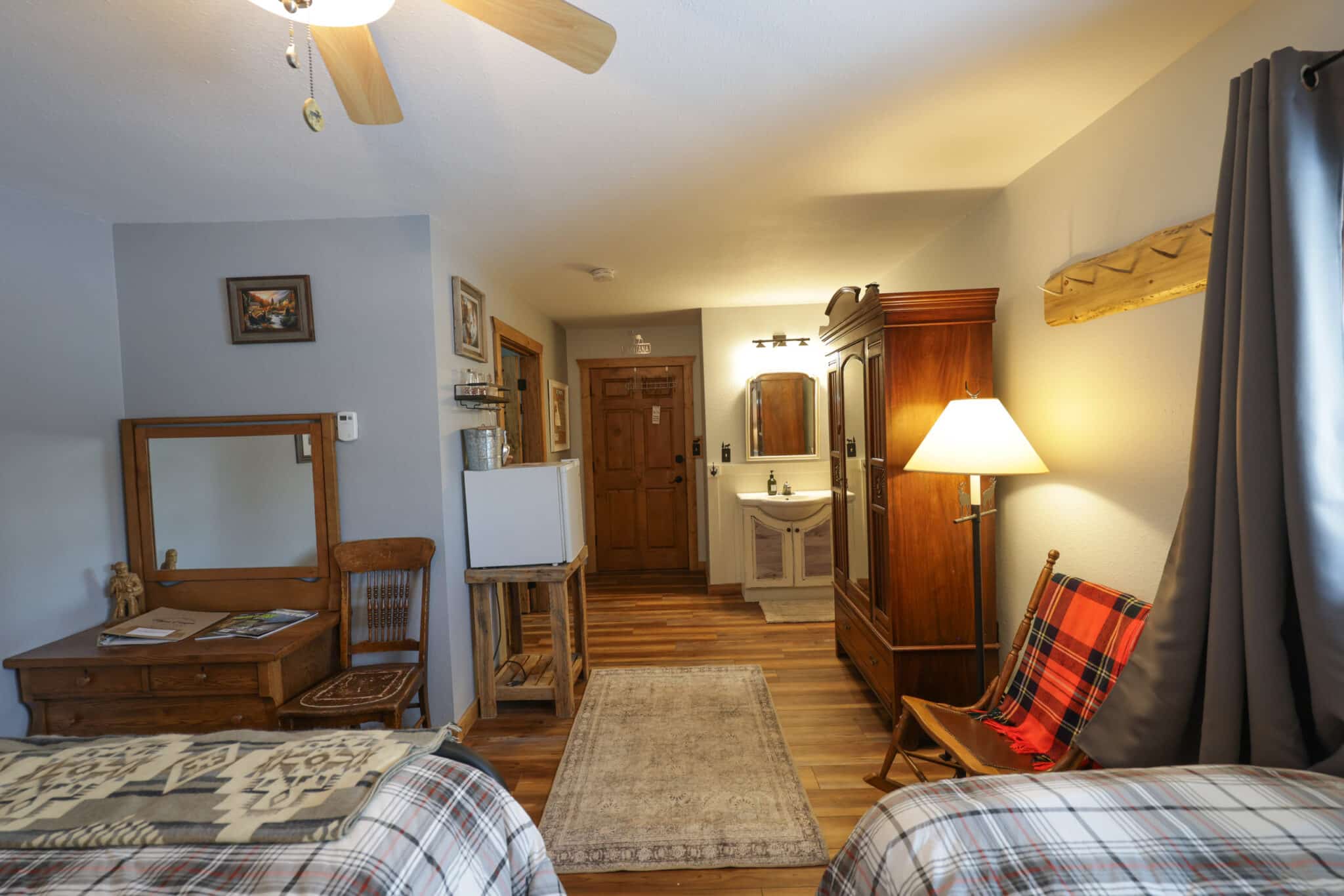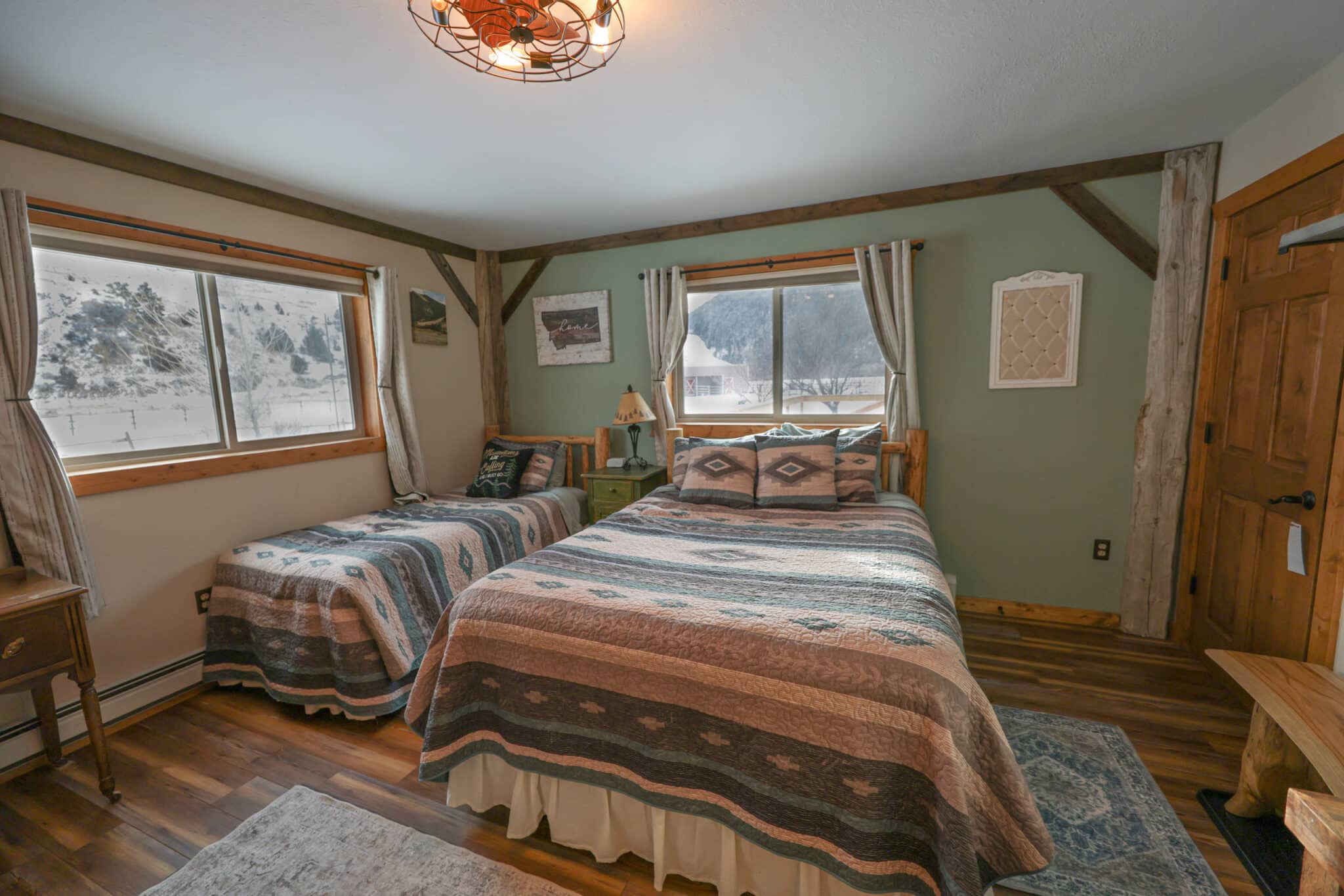 CABIN 1A: Putting your feet up in our two bedroom one bath cabin with a mini kitchen is easy to forget time as this cabin is situated so you can enjoy the beautiful Montana sunsets. Master bedroom has a queen and single bed. The second bedroom consists of a single bed and a set of bunks. Cabin is minimum of three guests.